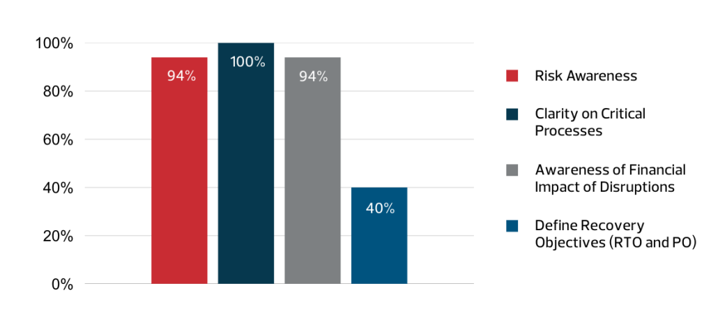 Risk awareness across respondents is notably high. In the survey, 94% of organizations report moderate to high awareness of their top operational risks and external dependencies, while 100% indicate clarity on which processes must resume within 24-48 hours to prevent significant loss. Awareness of the potential financial impact of a one-day disruption is similarly high at 94%.