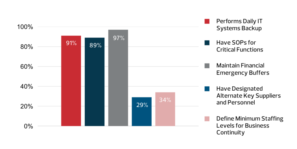 Foundational safeguards are largely in place. 91% of respondents report daily IT system backups, 89% have documented SOPs for critical functions, and 97% maintain a financial buffer for emergencies or business interruptions. These controls suggest a solid baseline of preparedness across many organizations.