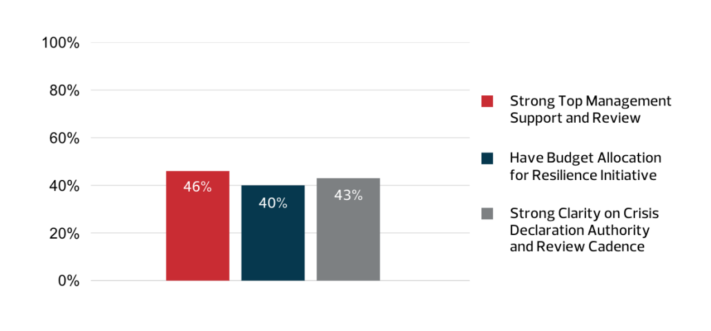 Leadership intent is encouraging but unevenly institutionalized. 46% of respondents rate top-management support and review of resilience planning as strong, reflecting visible executive interest. However, only 40% rate budget allocation for resilience initiatives as strong, and 43% indicate strong clarity around crisis declaration authority and review cadence.