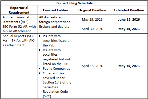 The Securities and Exchange Commission (SEC) announced an extension of deadlines for filing 2025 Annual Financial Statements (AFS) and related reportorial requirements for corporations with a fiscal year ending December 31, 2025. This extension follows the Bureau of Internal Revenue’s (BIR) issuance of Revenue Memorandum Circular No. 30-2026, which moved the deadline for filing 2025 Annual Income Tax Returns (AITR) to May 15, 2026