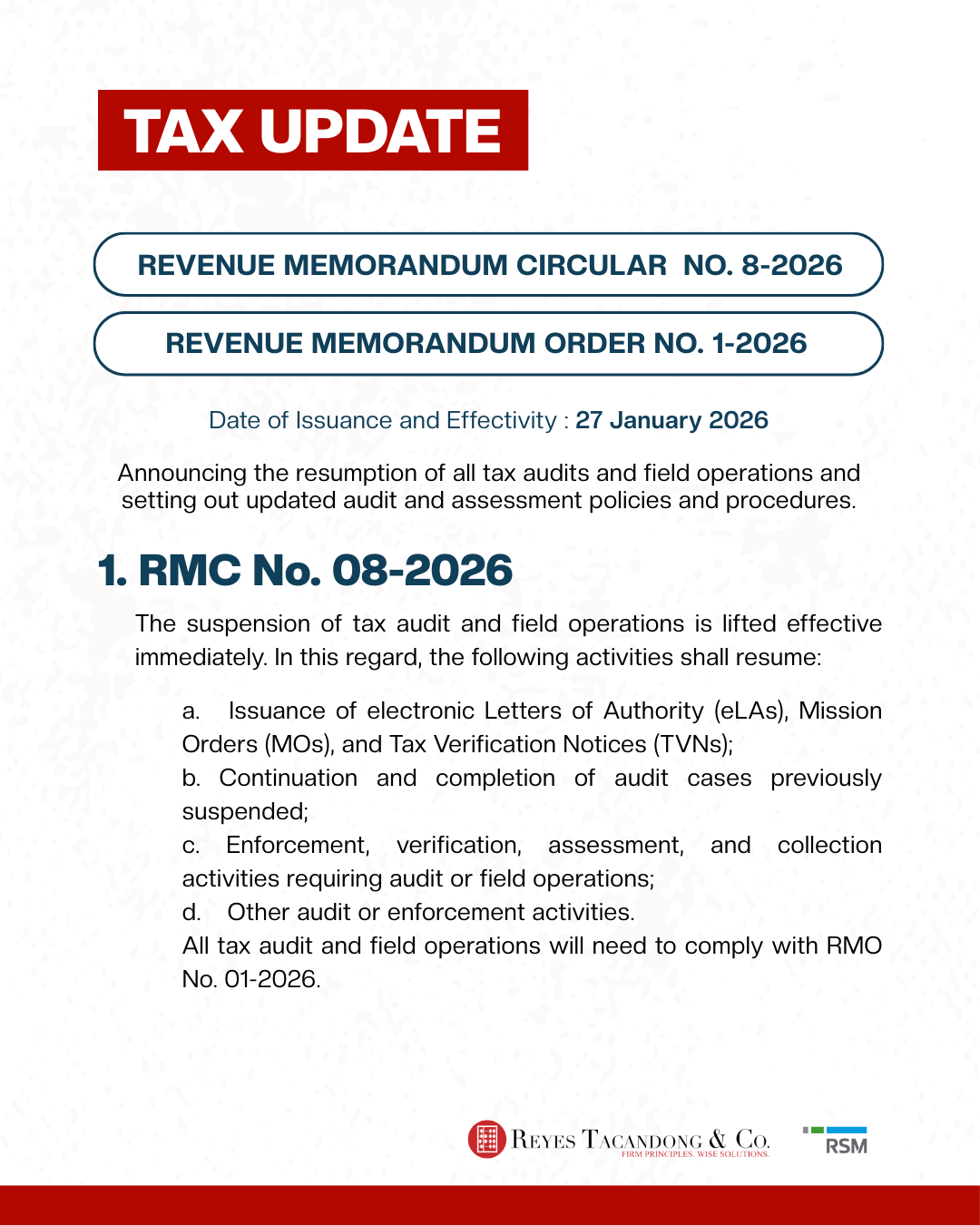 The update covers RMC No. 8-2026 and RMO No. 1-2026, which officially resumes tax audits and field operations as of January 27, 2026.